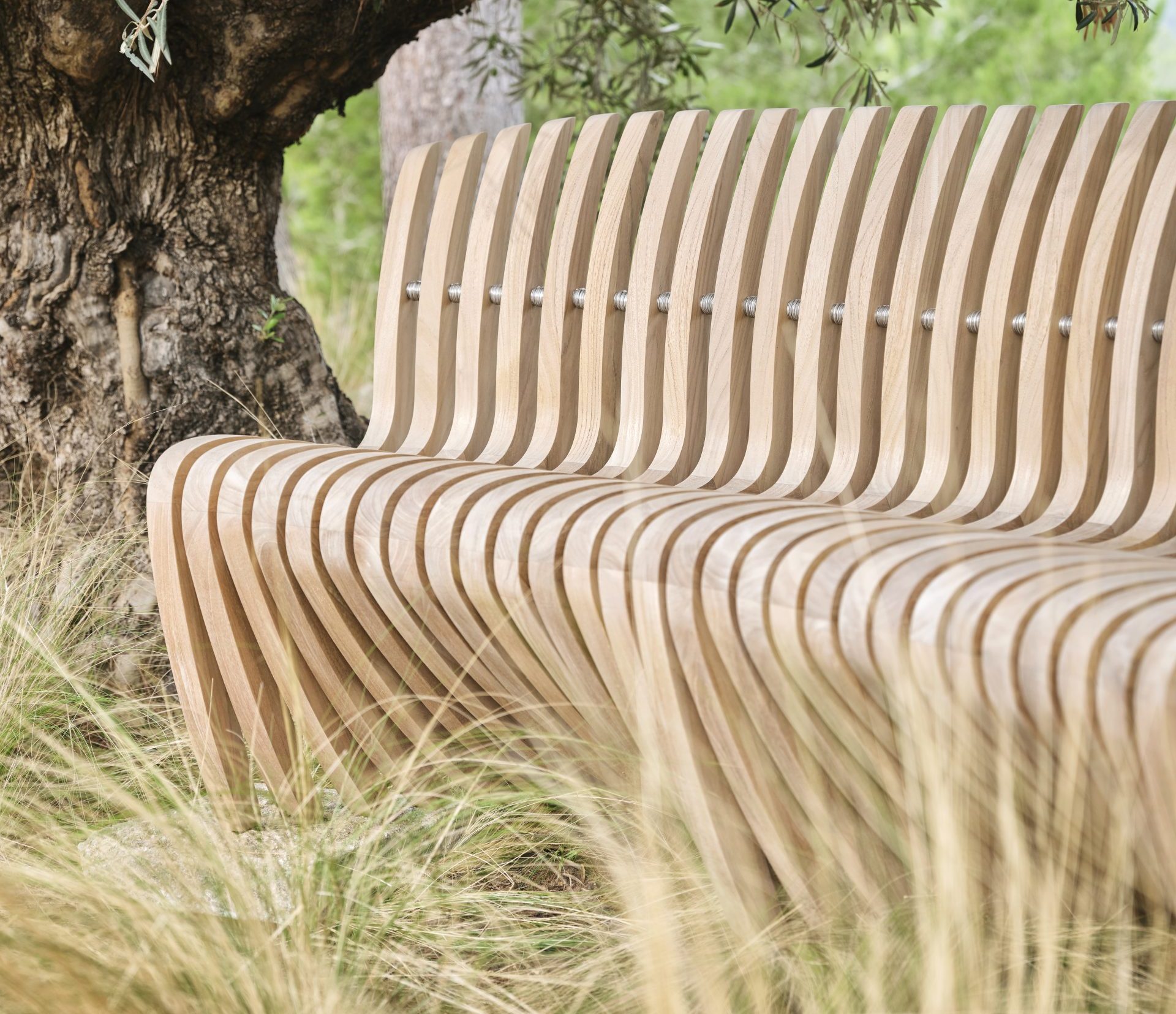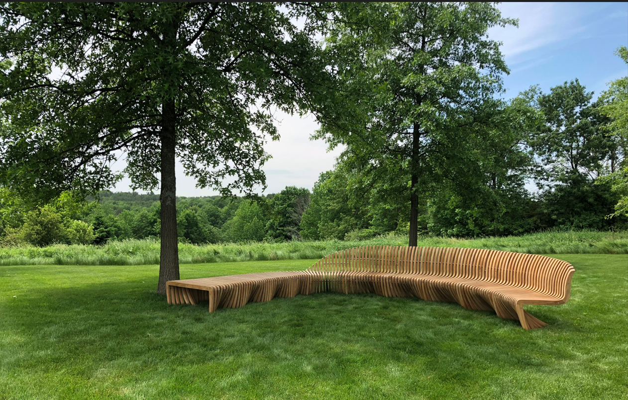 A Gravity-Defying Masterpiece originally designed by Robert Tiffany. This cantilever garden bench features 39 curved legs, intricately woven in a captivating caterpillar-like wave design. Handcrafted from teak, it’s fully customizable, letting you bring your unique vision to life. The weathered finish adds character, and its impossible angle is sure to captivate. Crafted from teak and fully customizable, the Ribbon Bench can be tailored to your specifications.